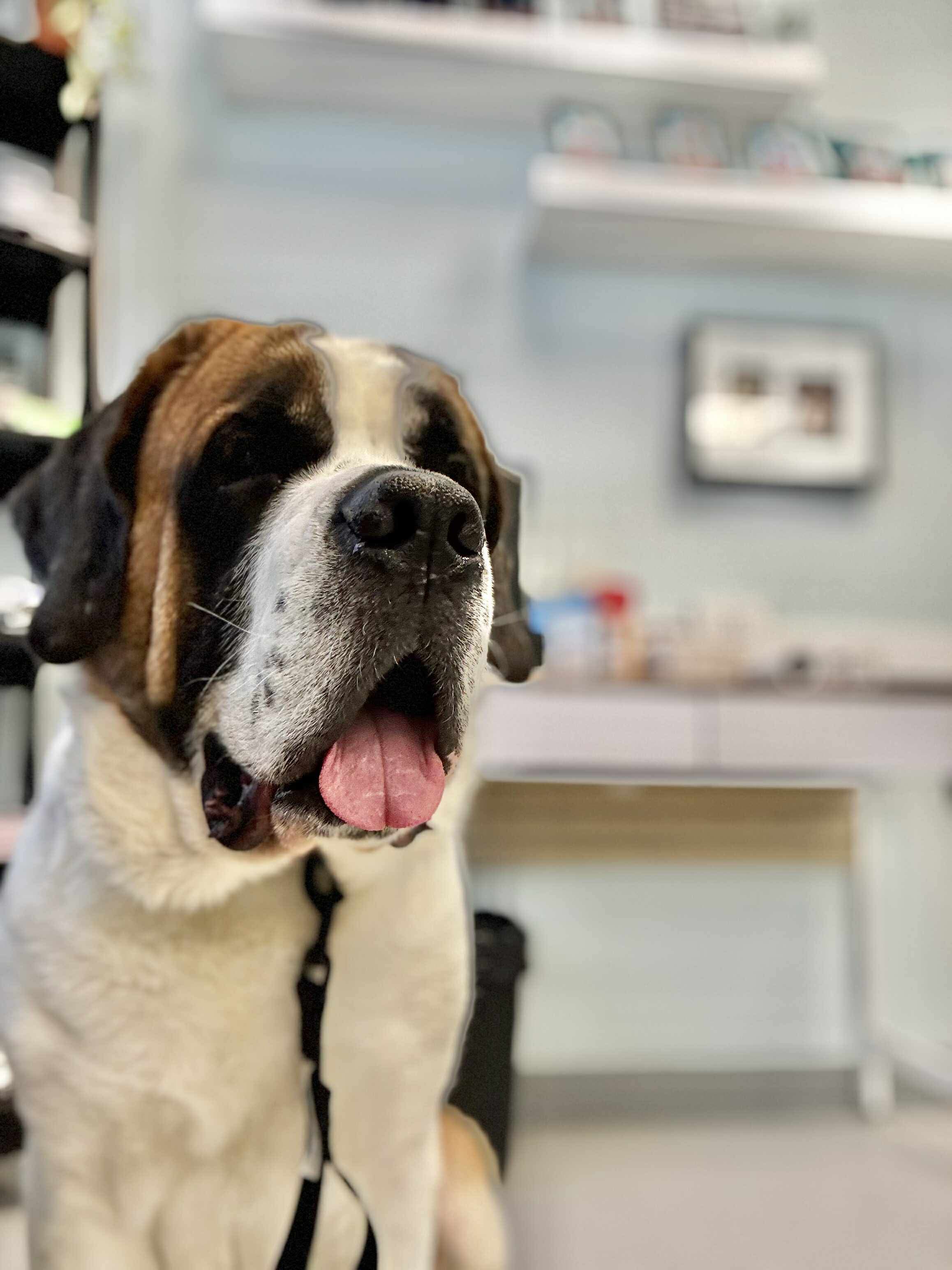 Breed: Saint Bernard Mix Age: 4 Energy: Medium Size: Giant Housetrained: Yes Crate trained: No Good with dogs: Maybe (slow intros and proper management/boundaries required)