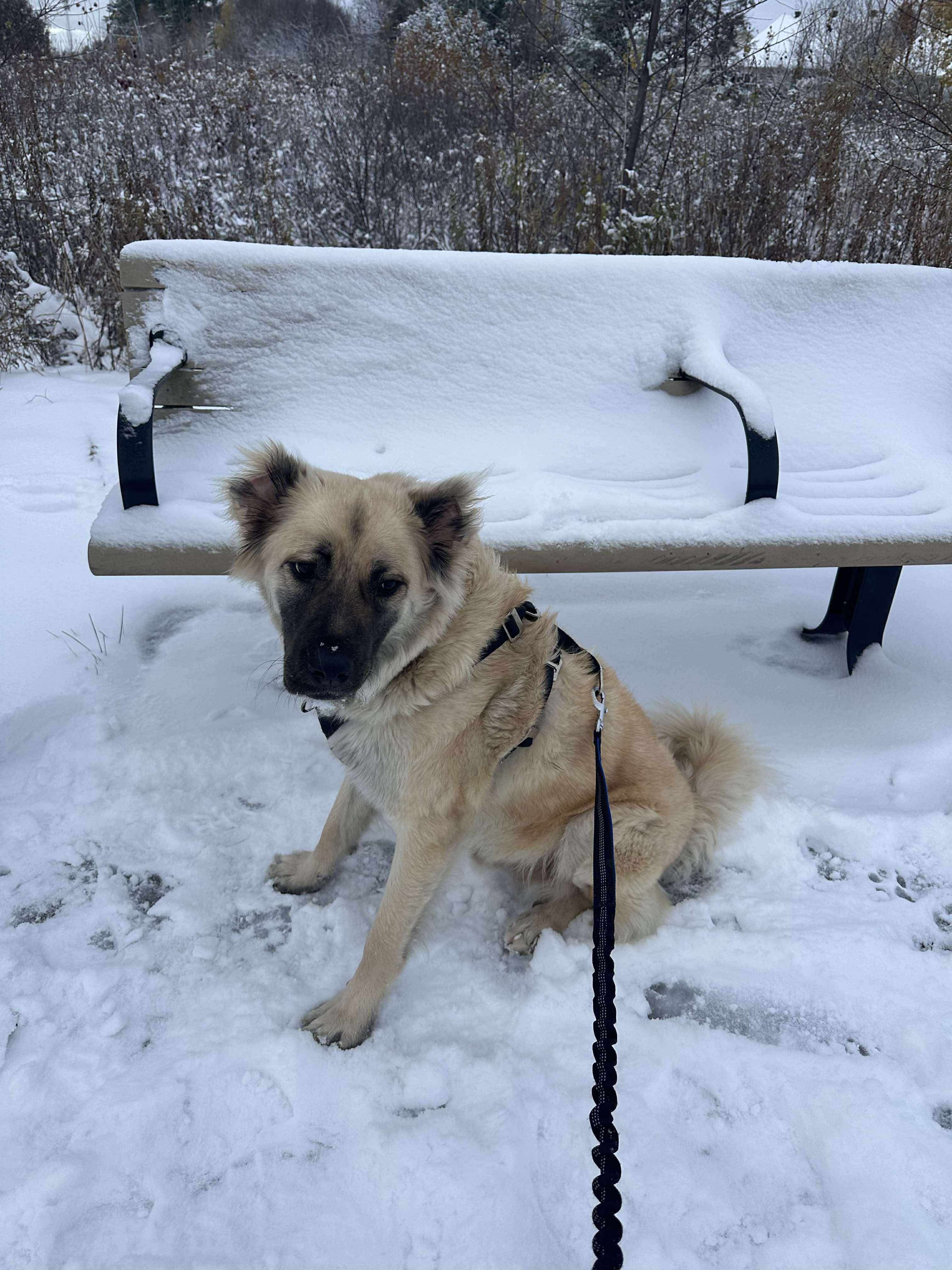 He’s learning to walk on leash, and while he sometimes gets a little excited and spins in circles, he’s improving every day. On familiar paths, he walks beautifully, especially with a calm, guiding hand.