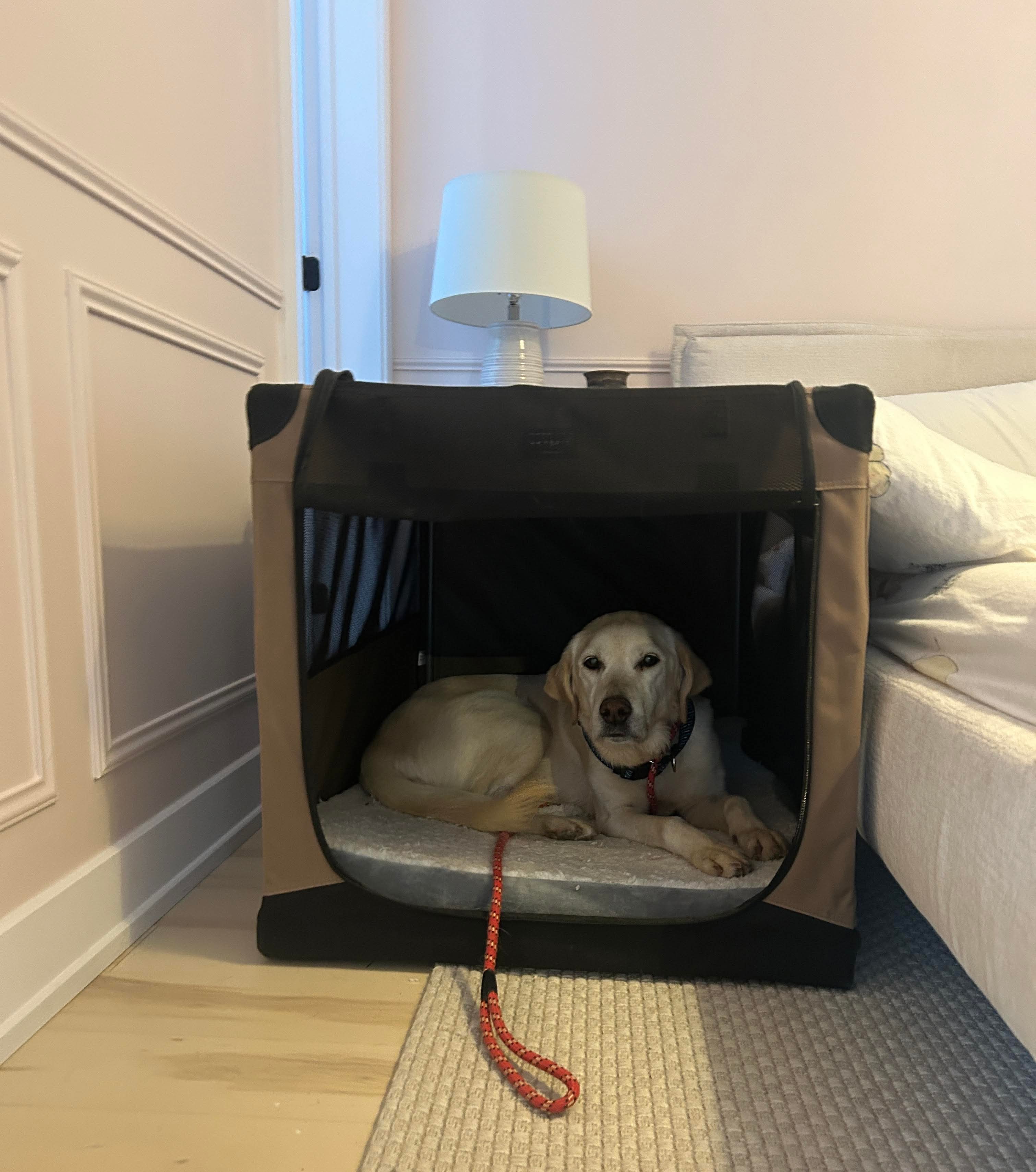 Rumba is very comfortable in her crate and happily chooses it for naps and bedtime. She’s still learning to be home alone and may bark when separated from people, so she would do best in a home where someone is around most of the time. In return, she’ll be your 10/10 work-from-home companion.