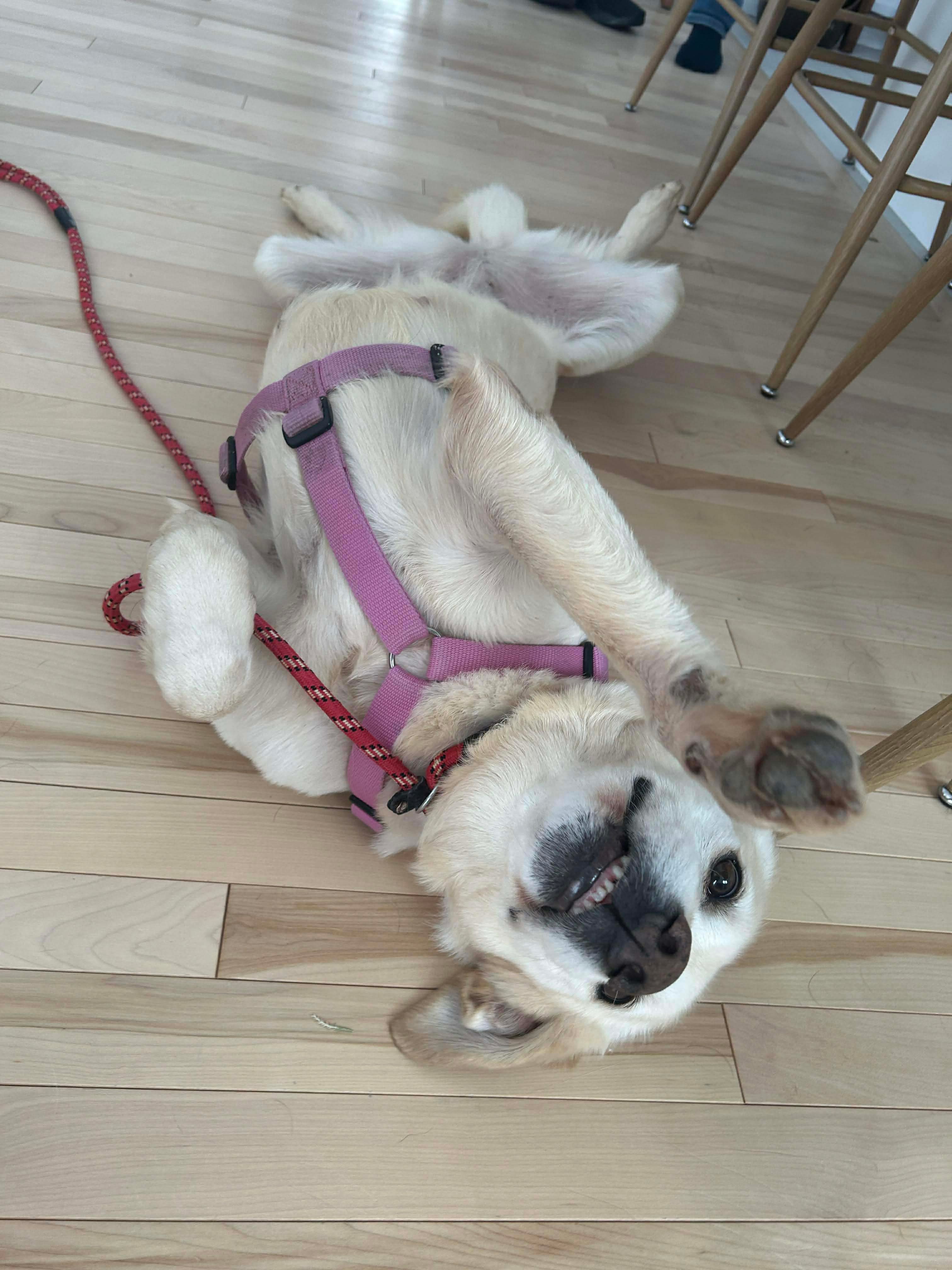 She’s working on her house training and does best with a predictable potty schedule (about every four hours), which helps prevent accidents. On walks, she can sometimes pull when excited but also walks nicely on a harness depending on her energy level.