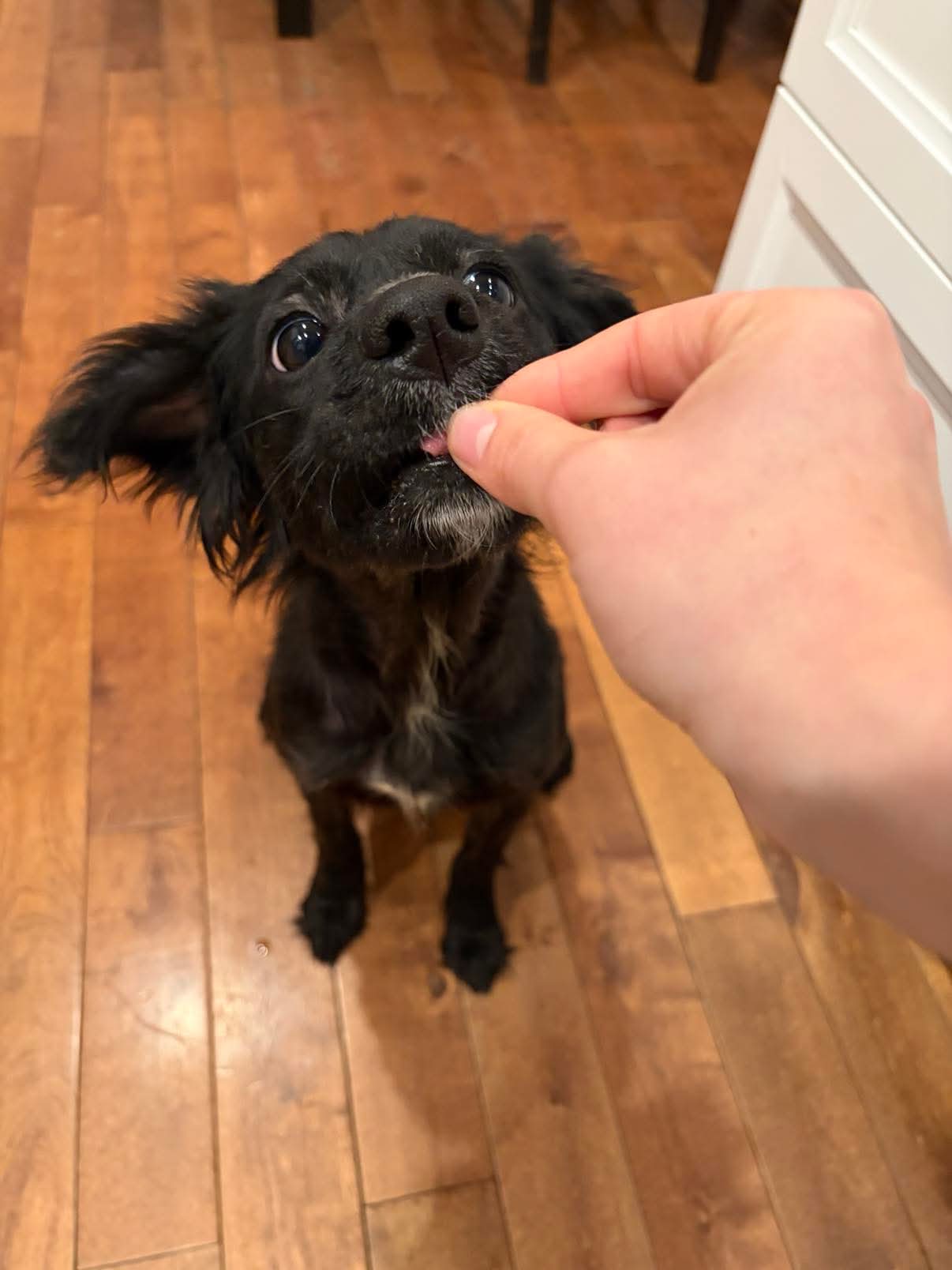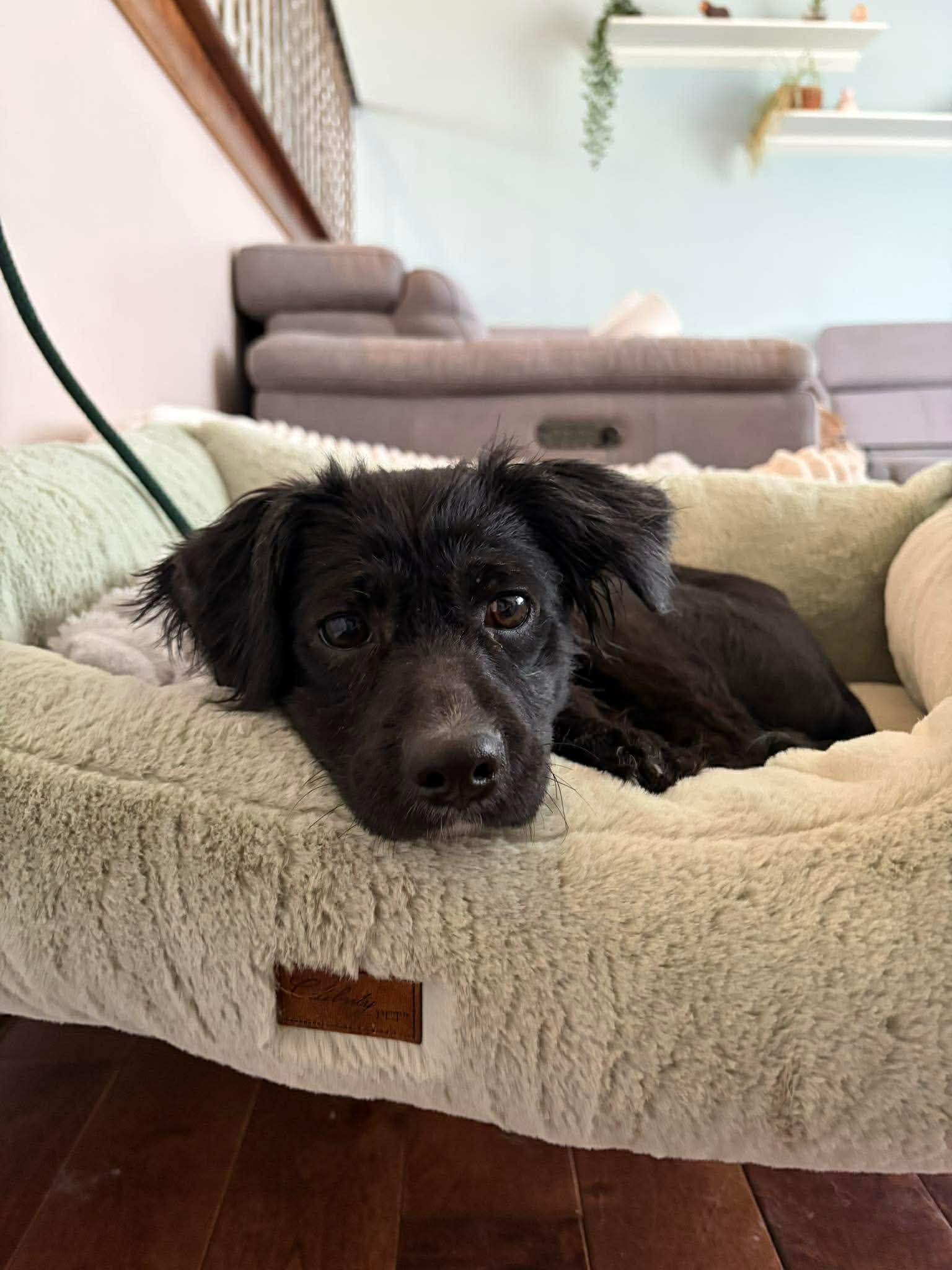 Sprint is crate trained and likes to learn new tricks. She also will sneakily find socks and bring them to her crate to make a nest. She has a puppy vibe. True to her name, she likes to sprint in the backyard. She likes to be cozy in her bed and get snuggles. She’s very affectionate with her people!