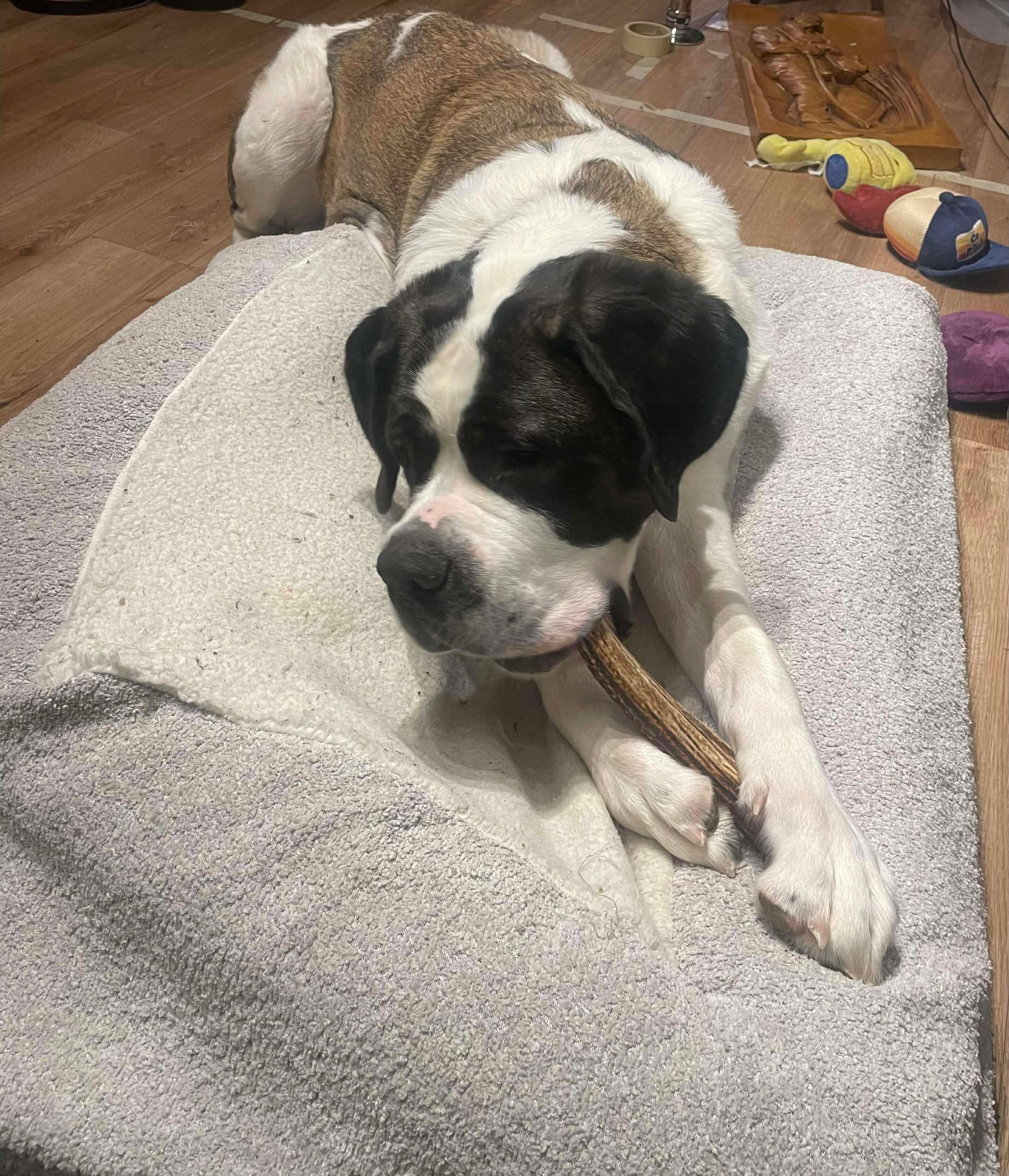 She loves to play snuffle games, chewing on her antler and playing tug. She is scared of squeaky toys! Even though she has the occasional zoomies episode, Vixen enjoys a nice, long nap. She knows how to sit, lay down and give paw, currently working on stay.